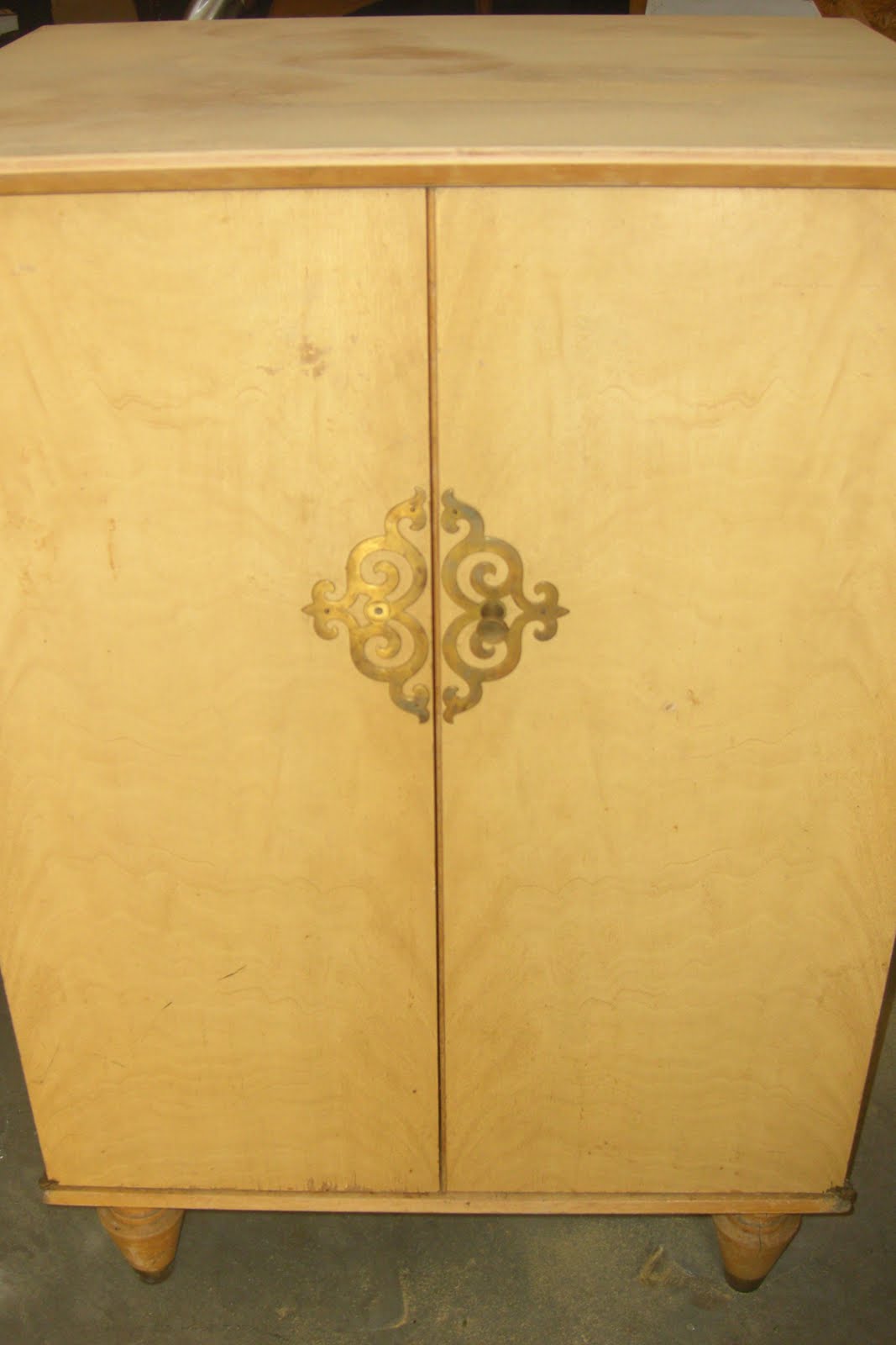 I have been looking for a nightstand for a loooooonnnnggg time to for our master bedroom. The issue was the bed, it is big and high so a regular size nightstand just looked funny next to the bed. When I was out treasure hunting I found this piece for $10. It is taller than a nightstand, smaller than a cabinet..not sure what this thing is, but the size was perfect. The looks on the other hand weren't perfect.... pictures don't do it's ugliness justice, it had coats of yellowing polyurethane, it had that old smell and the inside was really beat up, but I loved the lines and the metal details on the doors.